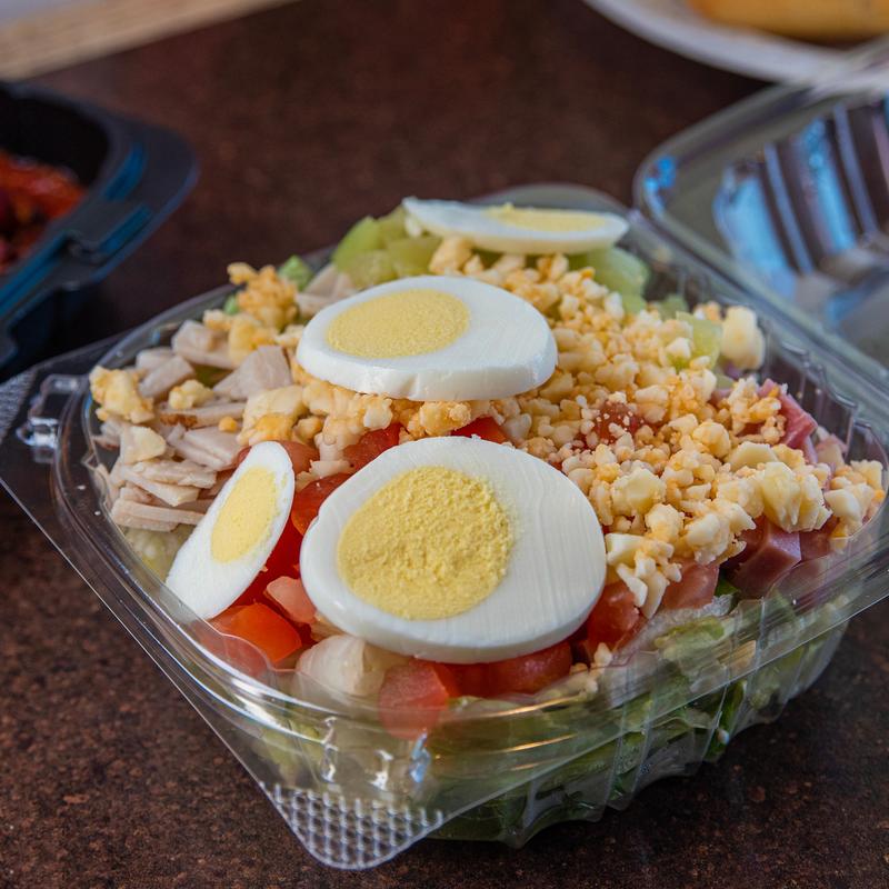 Fresh mixed greens, cherry tomatoes, red onions, banana peppers, black olives, chick peas/garbanzo beans, parmesan cheese, mozzarella and muenster cheese mix, salami, ham